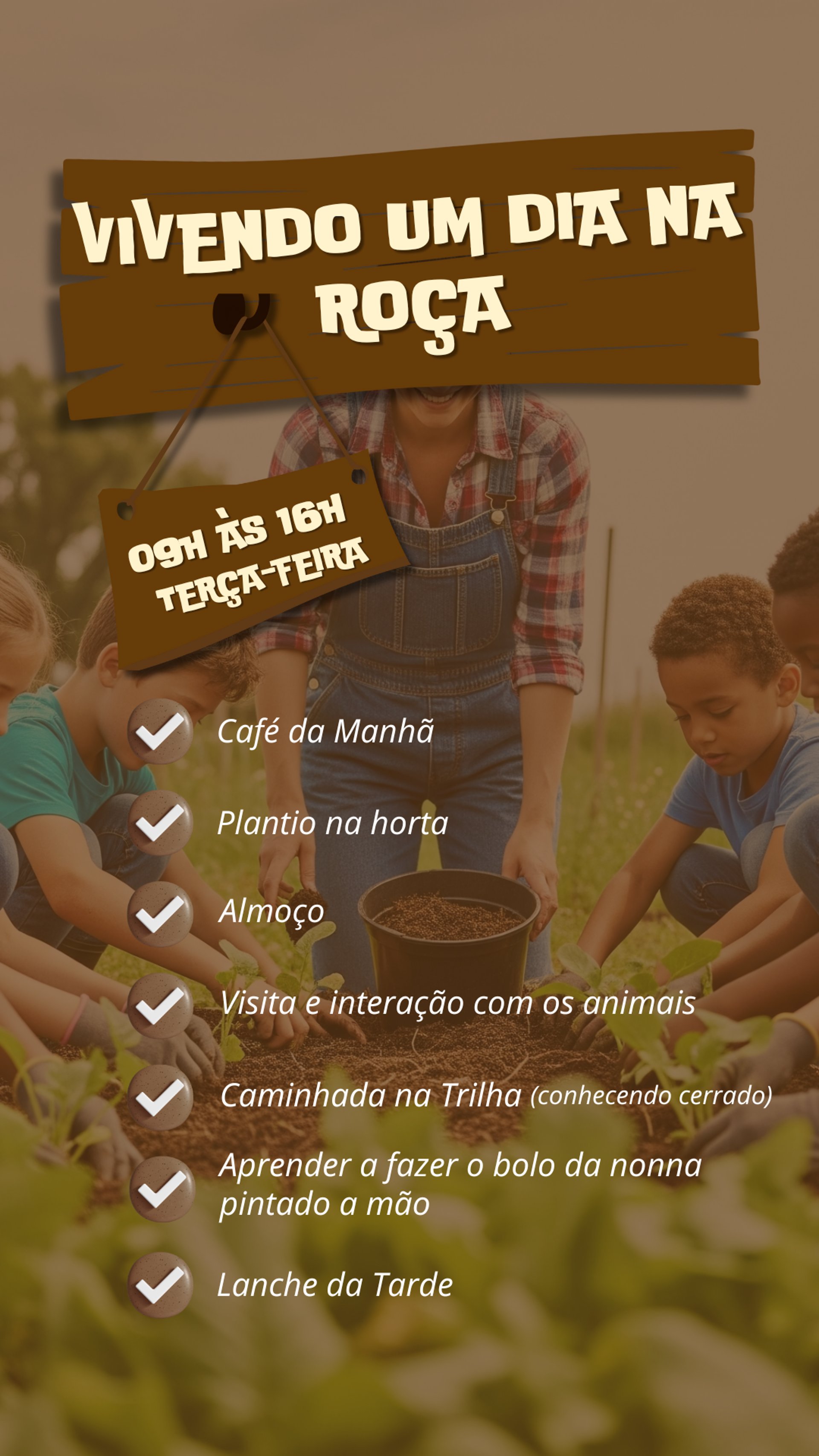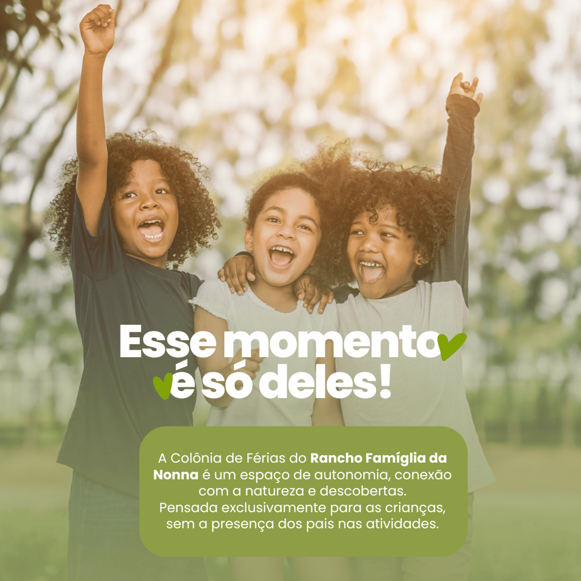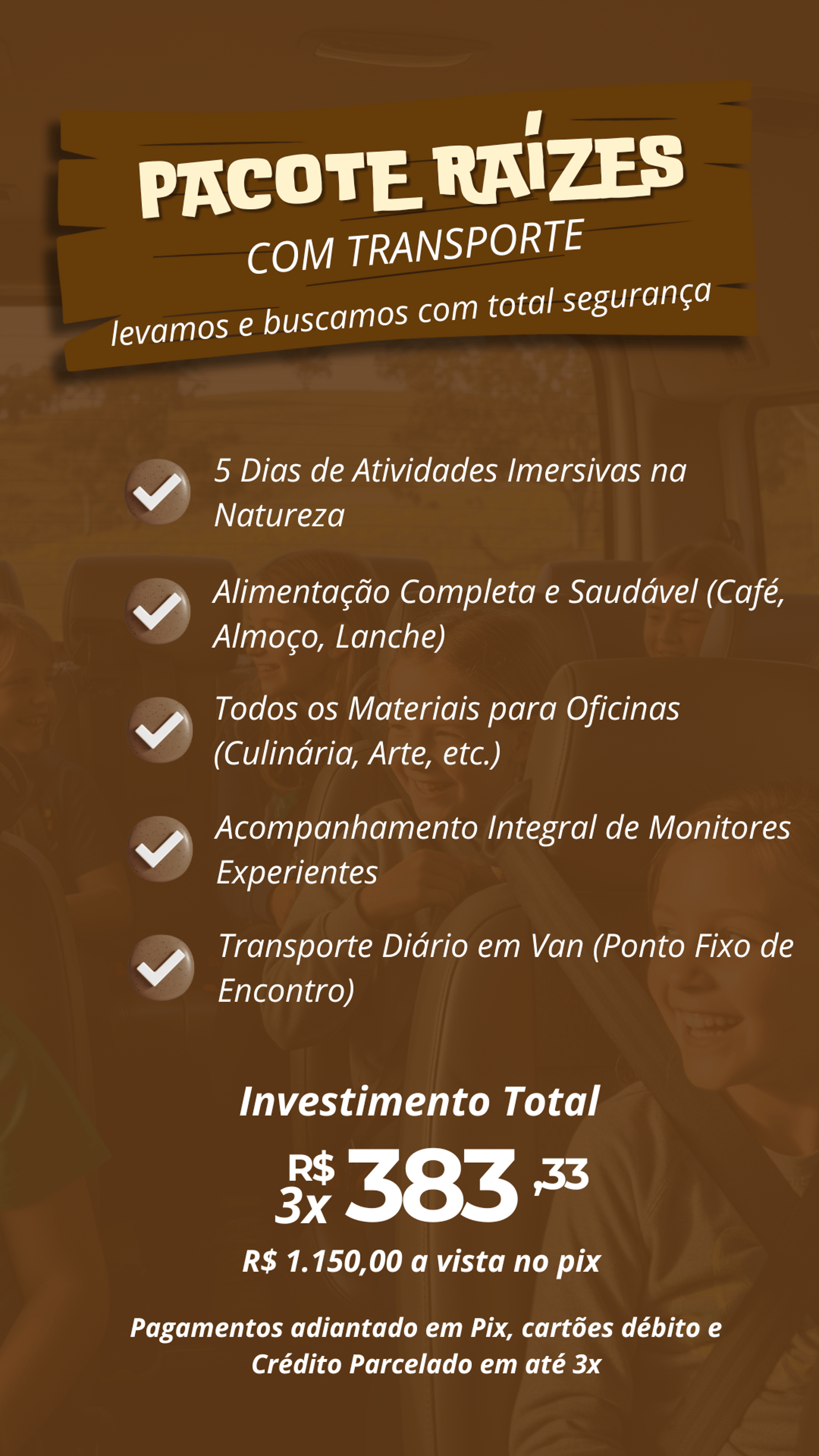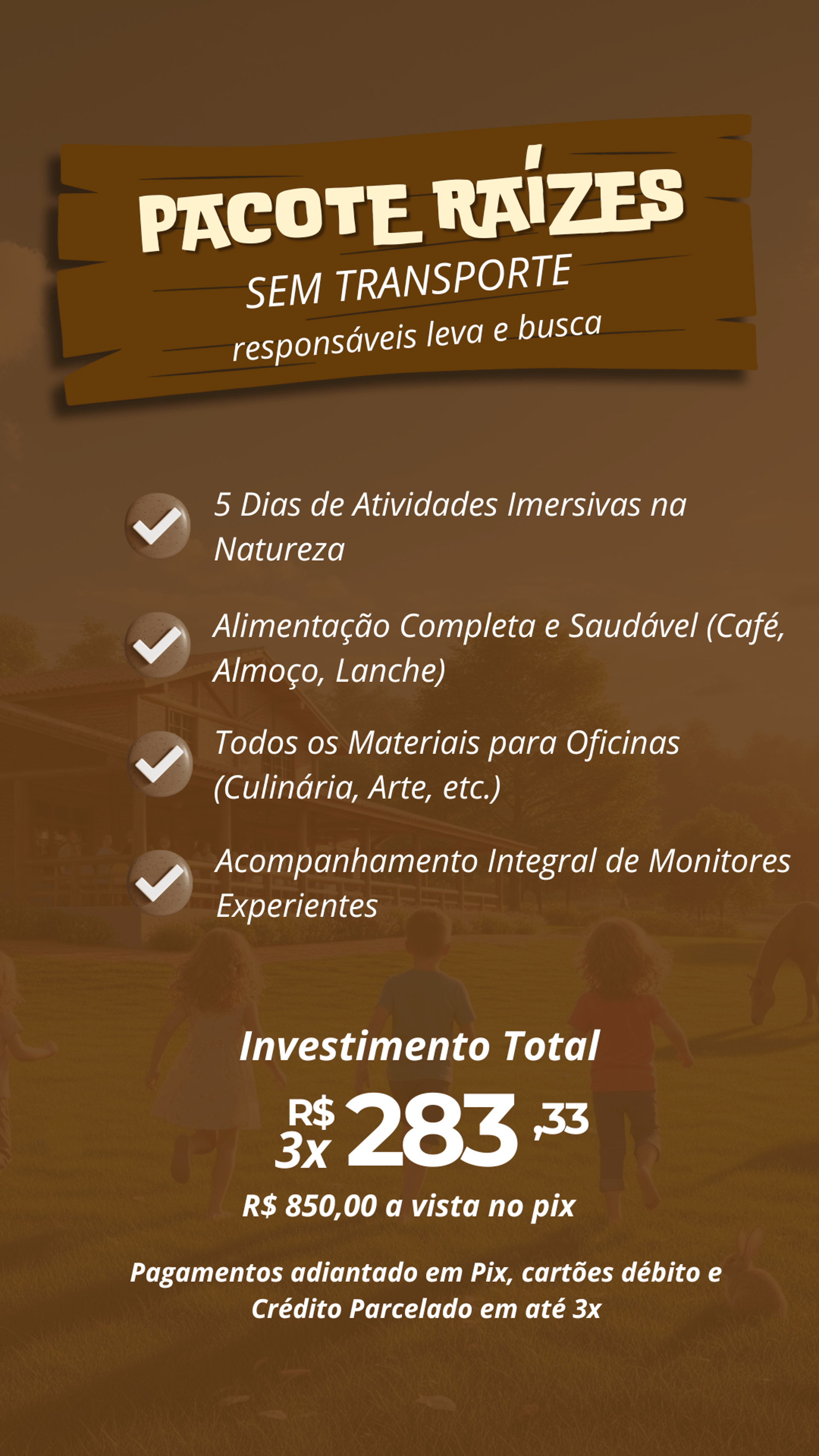 Todos os pacotes incluem alimentação completa e atividades guiadas com muito carinho e segurança no Rancho 🌿