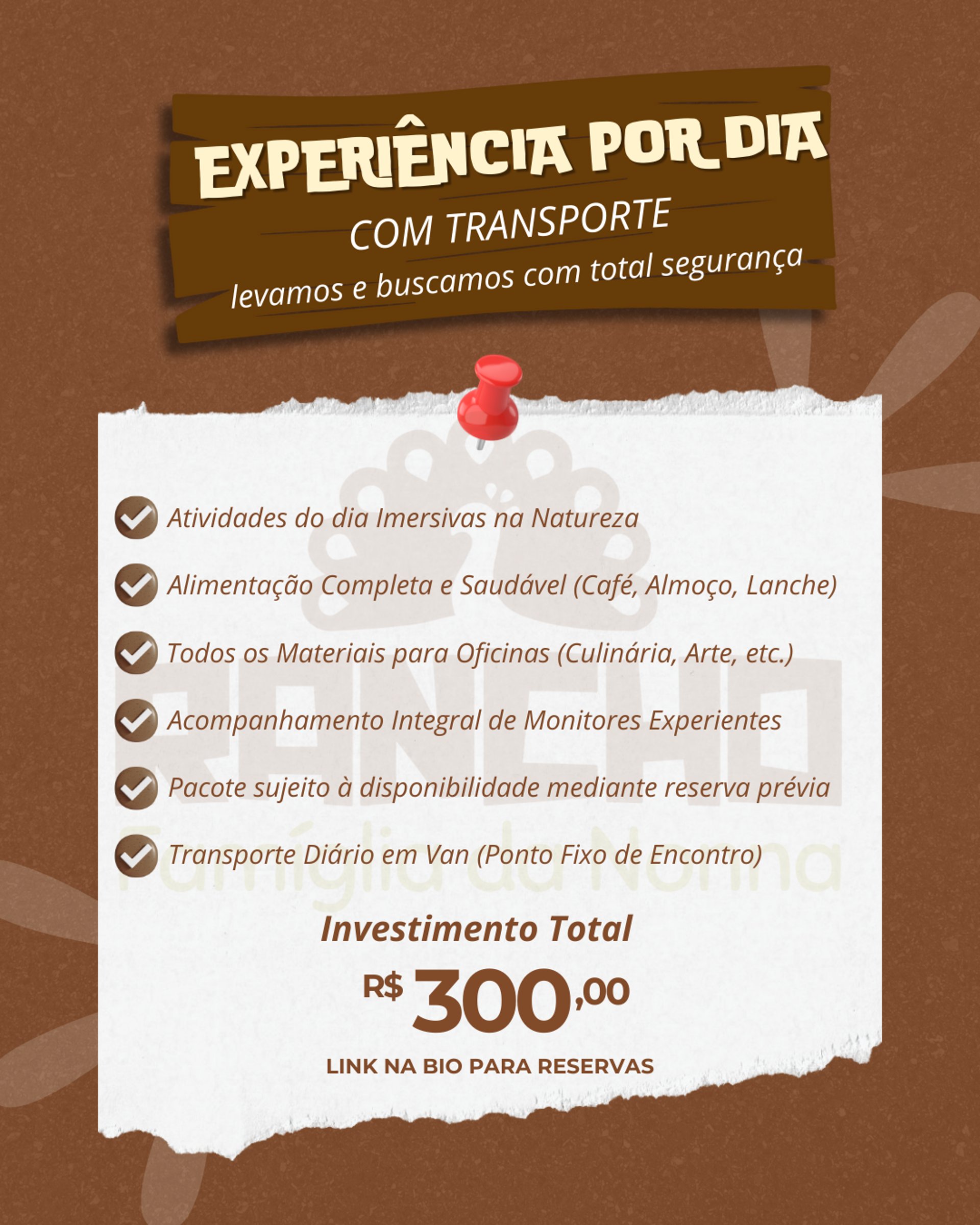 Para o "Pacote Aventura", definimos um ponto de encontro fixo em uma localização central e segura de Cuiabá (o endereço exato será informado aos inscritos). Nossa van, devidamente identificada e com motorista profissional, buscará as crianças no horário combinado pela manhã e as retornará ao mesmo ponto no final da tarde.