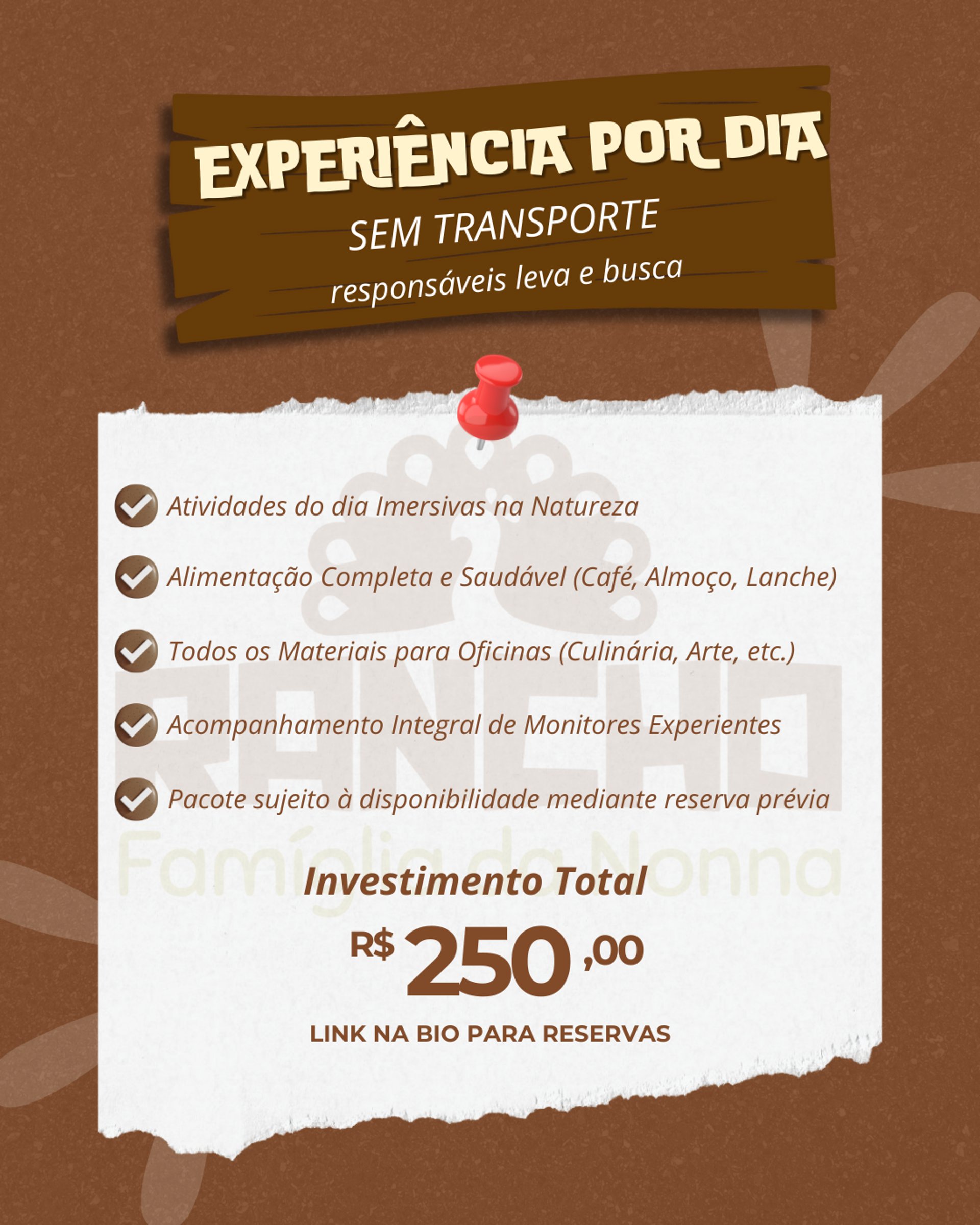 Sabemos que a rotina nem sempre permite 5 dias inteiros de diversão, Cada dia no Rancho é cheio de atividades ao ar livre, contato com a natureza, carinho com os animais e alimentação completa. Tudo com segurança e cuidado que seu pequeno merece.